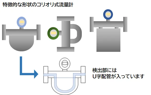 - コリオリ式流量計は検出部の形状が特徴的で、検出部には細いU字配管が入っています。