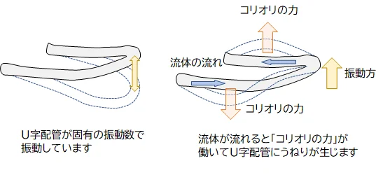 - このU字配管は固有の振動数で振動しており、その中を流体が流れると細いU字配管をねじ曲げようとする力が働き、U字配管にうねりが生じます。