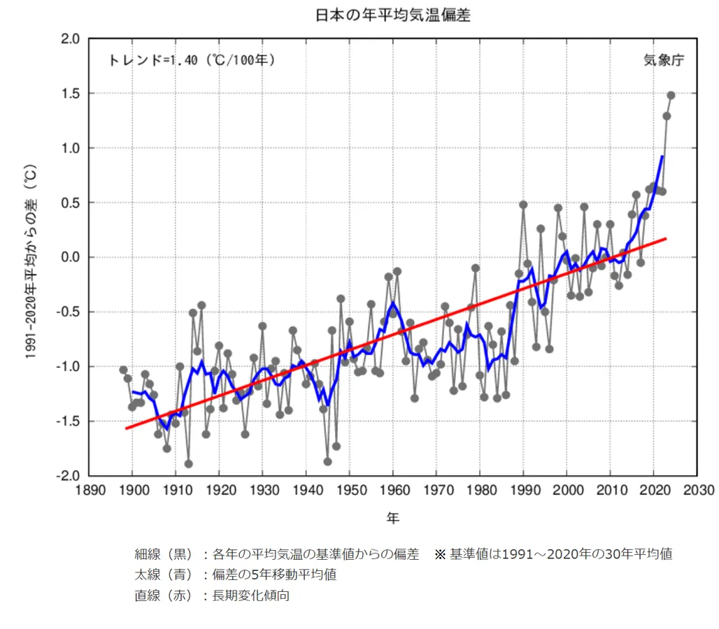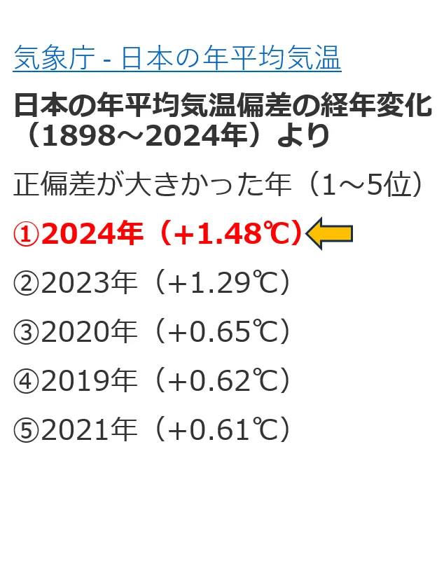 • 直近のほうが印象に残りやすいため、年明けからの強い寒波で厳しい雪や寒さをお感じの方も多いと思いますが、昨年夏の気温は相当なものでした。特に昨年の夏は非常に暑く、気象庁の1898年の統計開始以来、過去126年間で最も暑い夏でした。夏だけでなく、年間の平均気温の基準(30年間の平均値)で見ても、2024年は過去突出していた一昨年(2023年)をさらに上回る結果となっています。