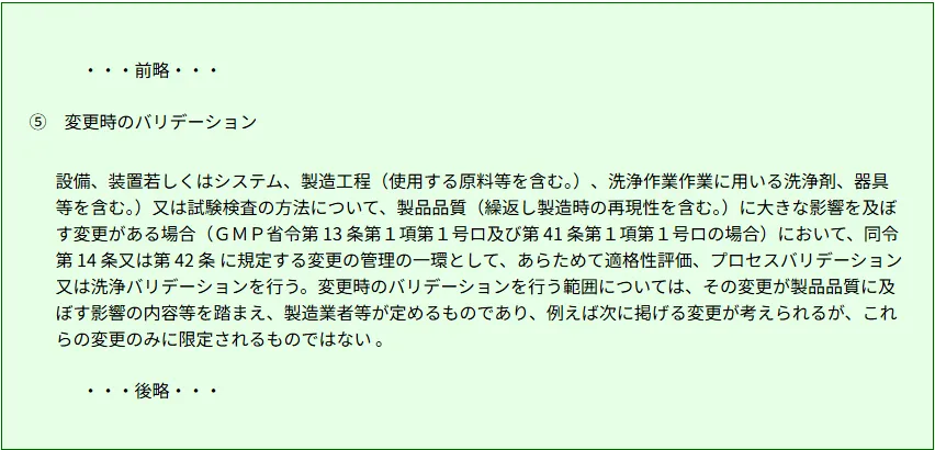 「 ~ 管理された状態を維持している旨を再確認するため、定期的に適格性評価、プロセスバリデーション又は洗浄バリデーションを行う。 ~ 」ことです。つまり、再バリデーションの目的は以前と同じバリデーションを行い、製品品質が変わっていない事を確認することです。 - よって、今回お客様が言われた「変更時の再バリデーション」とは、「 ⑤ 変更時のバリデーション 」のことを指していると思われます。