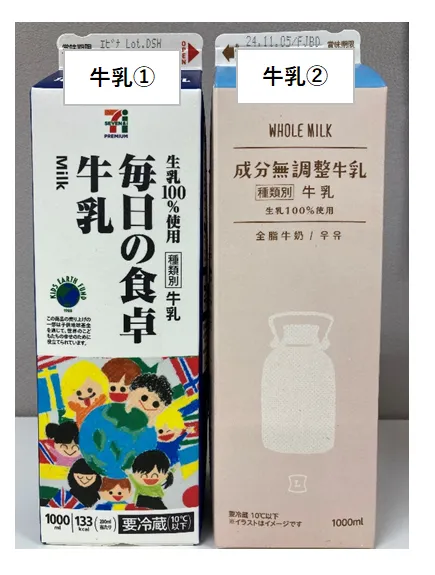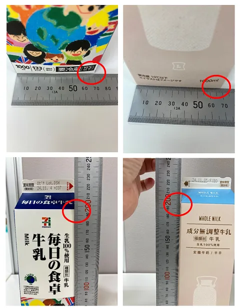 - 一方、牛乳の方をみていくと、容量は確かに共に約1000mLでしたが、重さをはかってみると、1029gと1033gでした。