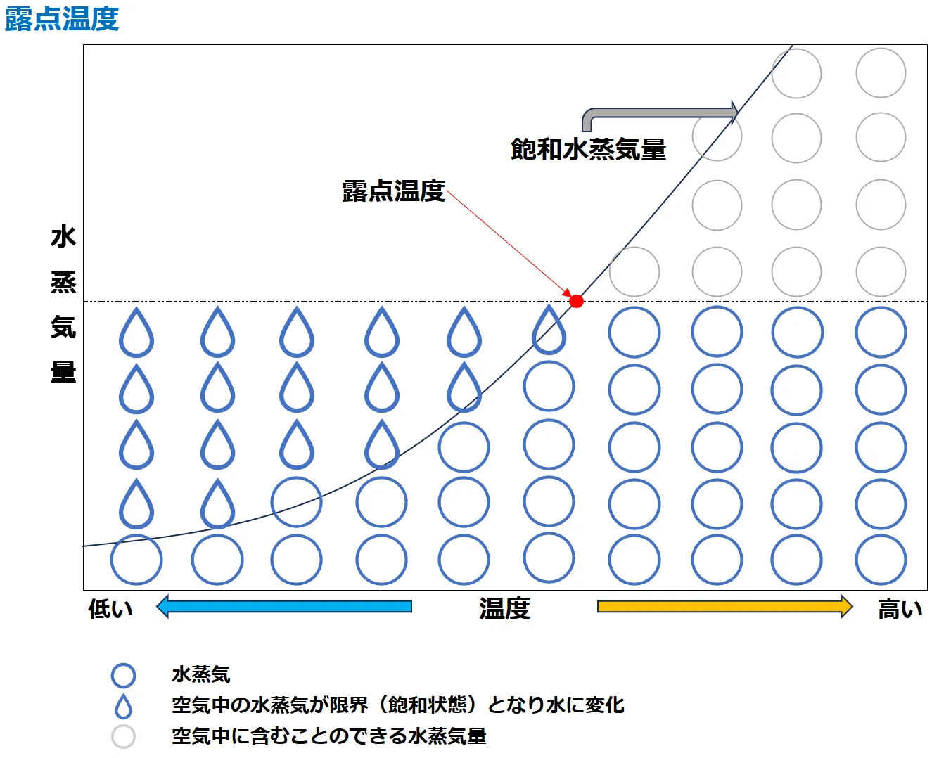 - 露点温度とは、空気が冷やされ含まれている水蒸気が水に変化するときの温度(空気中の水蒸気量が飽和水蒸気量と等しくなる温度)のことをいいます。