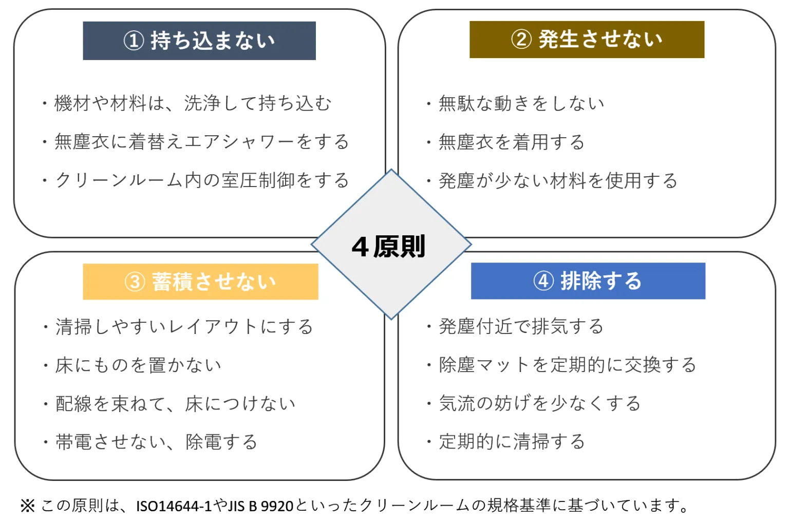 • 4つの原則には「微粒子・細菌を持ち込まない」「発生させない」「蓄積させない」「排除する」があります。