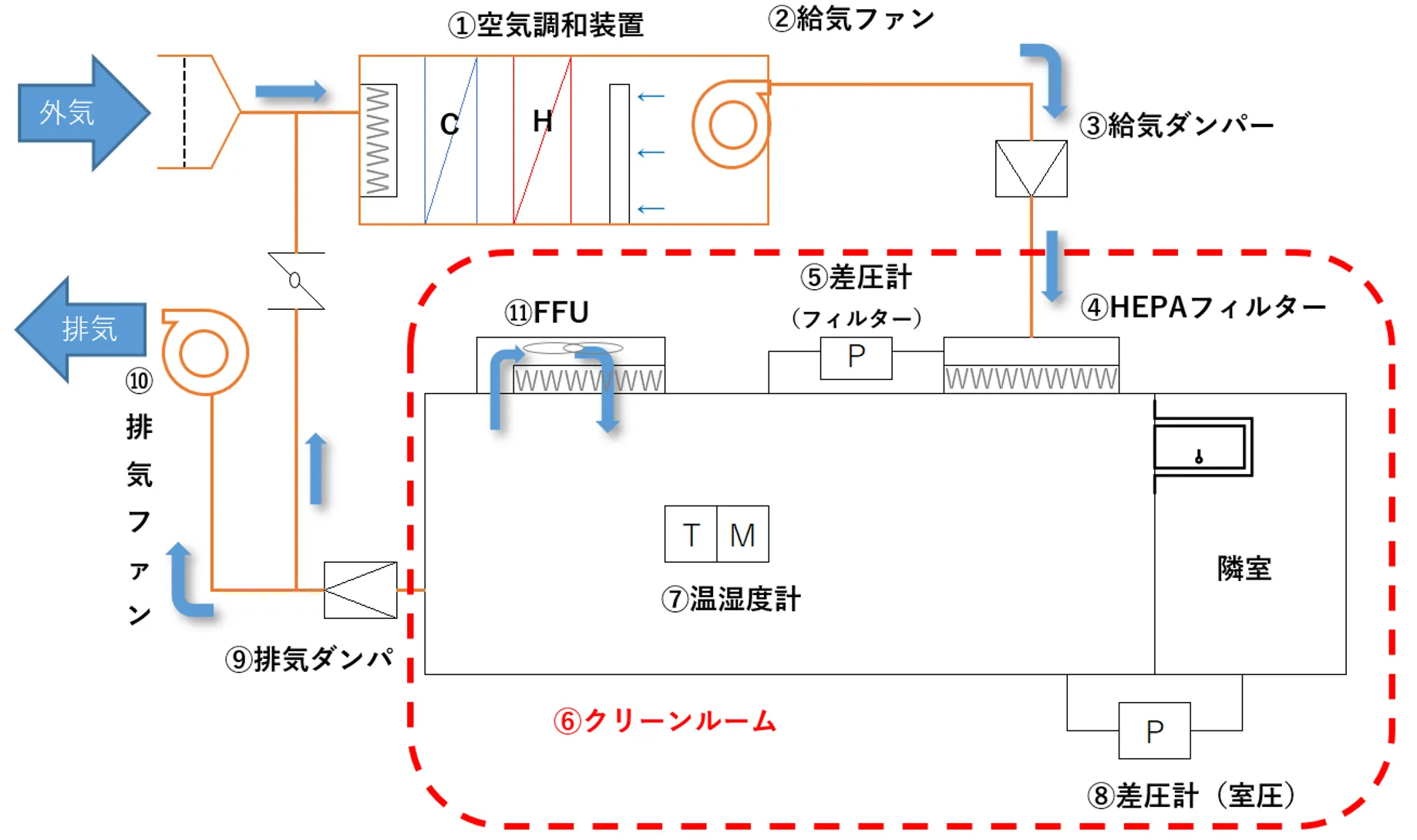 ⑥クリーンルーム空調・清浄化された空気で満たし、外部と隔離する空間。