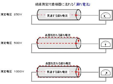 - 電気製品の絶縁抵抗を測る場合は、測定電圧が高すぎると製品に組み込まれた電子部品を破壊してしまう恐れがあります。