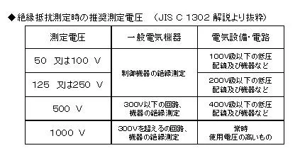 →この場合、絶縁抵抗計の測定電圧は500Vレンジ以下をお選び下さい) - また、一般的な電気機器の絶縁抵抗を検査する場合の推奨測定電圧は JIS C 1302で決められています。機器の定格電圧等を確認して測定電圧を決めてください。