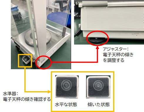 🔹電子天秤は水平を保った状態で使用しないと正しい測定ができないため、水準器で水平を確認して、傾いている場合はアジャスターで調整してから使用することになっています