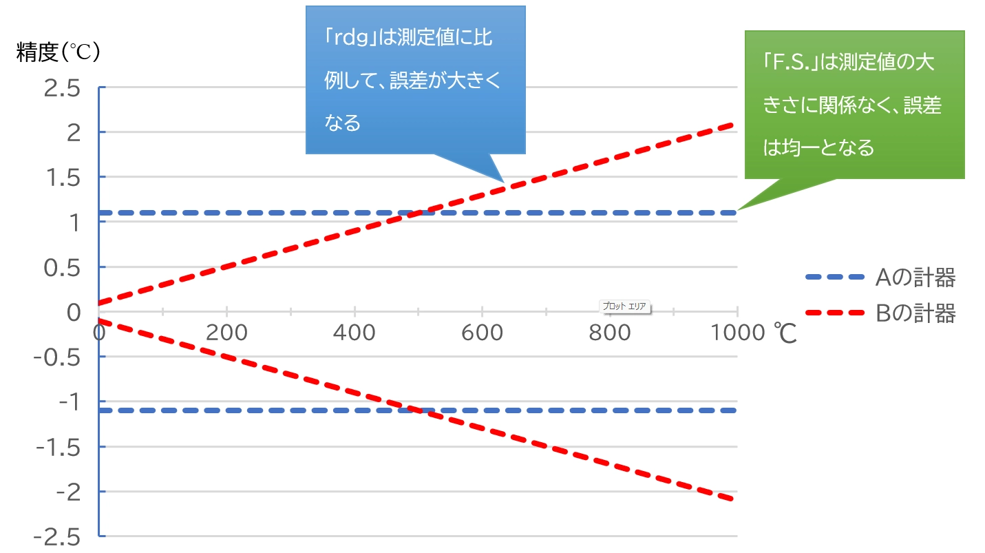 🔹精度表記にある数値の大小で良さは判断できず、精度の表し方(F.S.とrdg)によって、実質的(絶対値)な値が異なっています。
